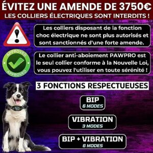 - 【CONFORME À LA NOUVELLE LOI : ÉVITEZ UNE AMENDE DE 3750€】En réponse à la nouvelle Loi sur le Bien-Être Animal qui interdit l’utilisation de la fonction choc électrique, PAWPRO vient de développer ce Collier Anti-Aboiement Haut de Gamme totalement conforme à la nouvelle réglementation Française. Les Colliers à Choc Électriques sont désormais interdits : évitez une amende importante et optez pour une solution légale et sécurisée avec le nouveau Collier anti-aboiement PAWPRO conforme à la loi.